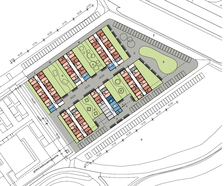 Het plan bestaat uit zes woongebouwen van drie en vier woonlagen met tweekamer woningen en voorzieningen als huiskamers en wasserettes.