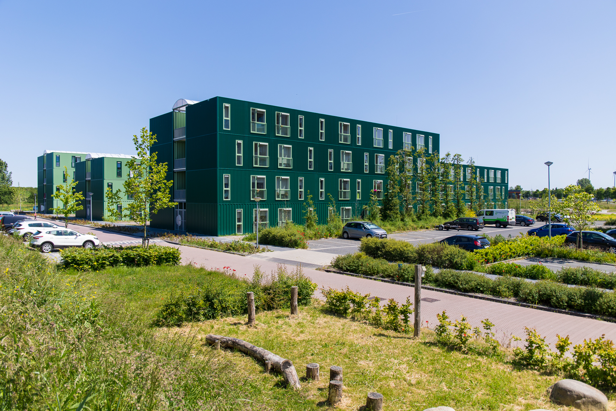 De kavel ligt naast ons appartementencomplex Madrona. Het plan voor tijdelijke woningen is in een zeer korte tijd door woningcorporatie de Alliantie en GoedeStede ontwikkeld op verzoek van de gemeente Almere.